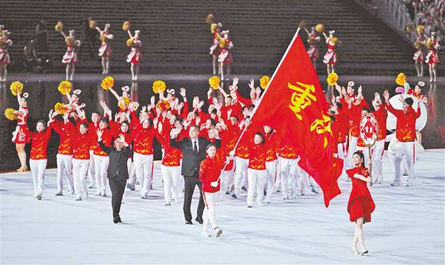 重庆姑娘、巴黎奥运会艺术体操冠军丁欣怡高举重庆代表团旗帜,昂首阔步走在队伍最前方,现场爆发出雷鸣般的欢呼声。丁欣怡从5岁开始在重庆市沙坪坝区学习艺术体操,在2024年巴黎奥运会上,她和队友一起夺得艺术体操冠军。