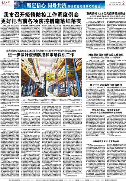 我市召开疫情防控工作调度例会 更好把当前各项防控措施落细落实重庆安排12.3亿元疫情防控资金进一步做好疫情防控和市场保供工作两江新区召开疫情防控工作会议重庆7万只喇叭宣传疫情防控坚定必胜信心 强化落实力度 齐心协力坚决打赢疫情防控阻击战研究加强新型冠状病毒感染的肺炎疫情防控工作市政府召开第81次常务会议