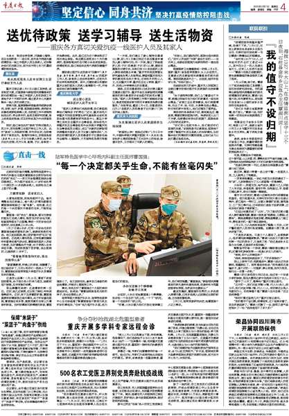 送优待政策 送学习辅导 送生活物资“我的值守不设归期”“每一个决定都关乎生命,不能有丝毫闪失”保障“米袋子”“菜篮子”“肉盘子”供给重庆开展多学科专家远程会诊荣昌协同四川两市开展联防保供500名农工党医卫界别党员奔赴抗疫战线