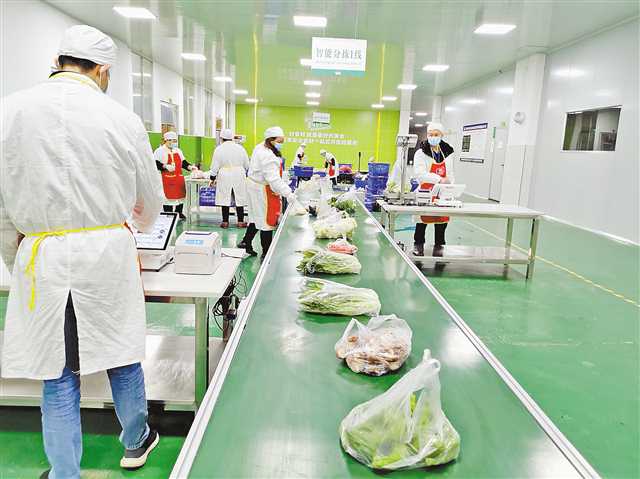 二月十四日,铜梁区某互联网企业流水线作业为下单的市民配装蔬菜。通讯员 赵武强 摄 |