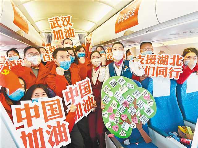 乘务员将大家的心愿纸贴在心愿树上。“武汉加油!”“中国必胜!”大家举起手中的标语牌和心愿树,握紧了拳头!