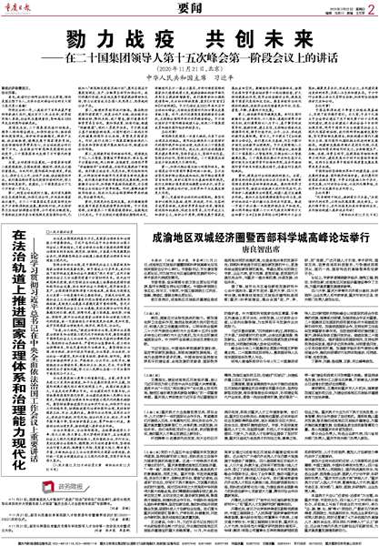 勠力战疫 共创未来在法治轨道上推进国家治理体系和治理能力现代化成渝地区双城经济圈暨西部科学城高峰论坛举行习近平出席二十国集团领导人第十五次峰会第一阶段会议并发表重要讲话深入贯彻党的十九届五中全会精神 积极推动成渝地区双城经济圈建设陈敏尔唐良智张轩王炯会见出席2020重庆英才大会的重要嘉宾2020重庆英才大会隆重开幕政务简报