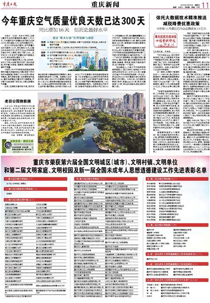 今年重庆空气质量优良天数已达300天依托大数据技术精准推送减税降费优惠政策老旧公园换新颜重庆市荣获第六届全国文明城区(城市)、文明村镇、文明单位和第二届文明家庭、文明校园及新一届全国未成年人思想道德建设工作先进表彰名单
