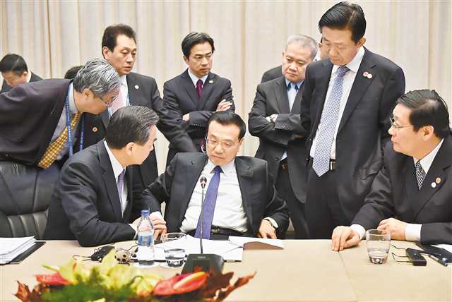 图⑨:2014年12月16日,李克强同志在贝尔格莱德出席第三次中国-中东欧国家领导人会晤。这是会谈间隙,他与随行部长进行会商。新华社发 |
