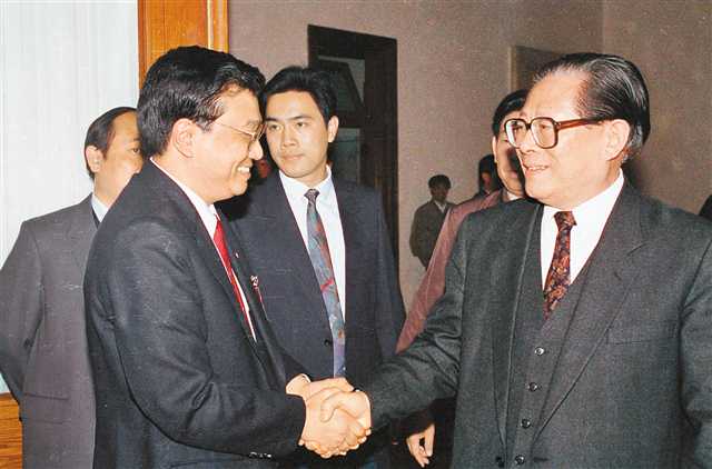 图②:1993年5月3日下午,中国共产主义青年团第十三次全国代表大会在北京人民大会堂开幕。在5月3日上午的预备会议后,举行第一次主席团会议,推选李克强等同志为主席团常务主席。这是江泽民同志与李克强同志握手。新华社记者 郭占英 摄 |
