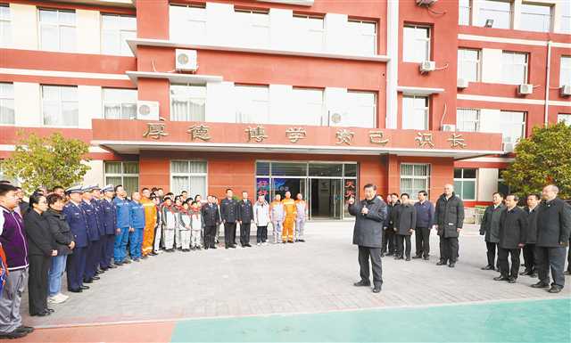 学校操场上,习近平亲切慰问了因公牺牲烈士家属和参与防汛抗洪救灾的基层党员干部群众、消防及应急救援人员、国企职工、志愿者代表等。习近平说,在这场抗洪抢险救灾斗争中,基层党员干部冲锋在前、勇于担当,人民解放军、武警部队官兵、消防救援队伍指战员挺身而出、向险前行,国有企业职工闻“汛”而动、紧急驰援,社会各界和志愿者积极参与、奉献爱心,书写了洪水无情人有情的人间大爱,展现了社会主义制度一方有难、八方支援的显著优势和全国人民万众一心、同舟共济的奋斗精神,涌现出许多感人故事。多名党员干部在抗洪抢险中牺牲,我们要永远怀念他们,大力宣扬他们的英勇事迹,有关方面要关心照顾好他们的家人。