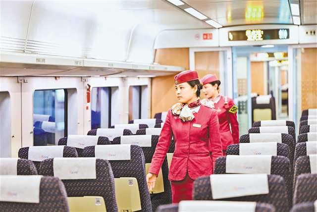 5月4日,石柱县开往重庆北的D6123次列车到达重庆北站后,重庆客运段动车二队青工尹露(前)与列车长一同巡视车厢,检查旅客遗失物品,确保旅客安全出行。通讯员 包亮 摄/视觉重庆