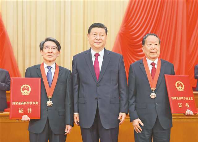 六月二十四日,全国科技大会、国家科学技术奖励大会和中国科学院第二十一次院士大会、中国工程院第十七次院士大会在北京人民大会堂隆重召开。中共中央总书记、国家主席、中央军委主席习近平向获得二〇二三年度国家最高科学技术奖的武汉大学李德仁院士(右)和清华大学薛其坤院士(左)颁奖。新华社记者 鞠鹏 摄 |