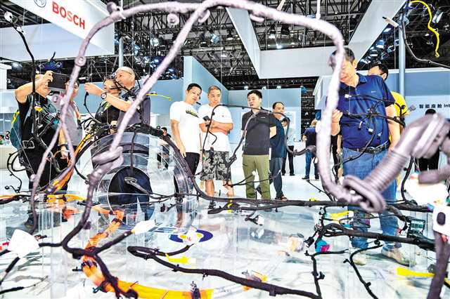 9月5日,重庆国际博览中心,观众在智博会上观看新能源汽车的“血脉”——全车线束结构。记者 崔力 摄/视觉重庆 |