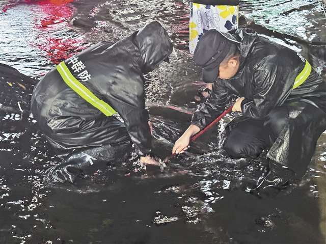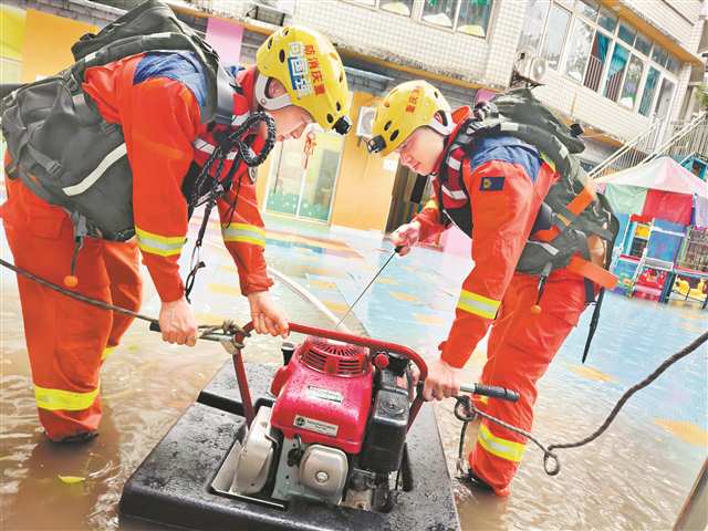 九月十二日,北碚消防救援人员将幼儿园内的积水排出。(受访者供图) |