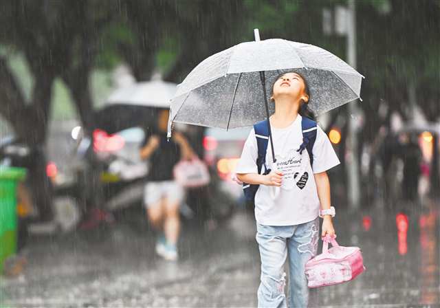 9月12日,南岸区水云路,上学的孩子仰望散落在伞上的雨珠。记者 谢智强 摄/视觉重庆 |