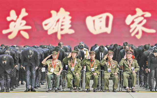 志愿军老战士在沈阳桃仙国际机场举行的迎回仪式上敬礼。 |