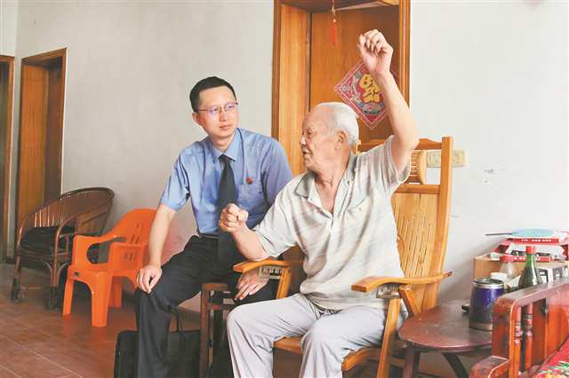 6月9日,石柱县检察院检察官走访秦家发烈士的亲友时,其战友回忆当年战斗的情景。 |