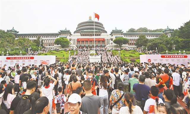 本报讯 (新重庆-重庆日报记者 卞立成)10月1日上午,重庆市在人民广场举行国庆升旗仪式,3000余人在现场观礼,为祖国母亲76岁生日送上祝福。