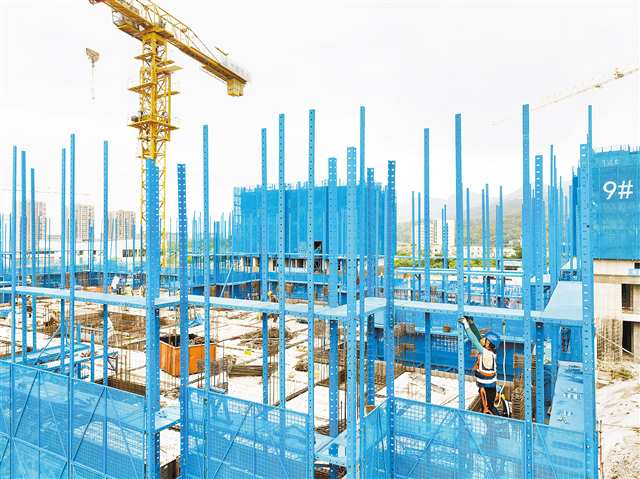 10月4日,巴南区鹿角安置房项目部内,工人正在施工,全力以赴抢工期、保进度,现场一派繁忙景象(无人机照片)。