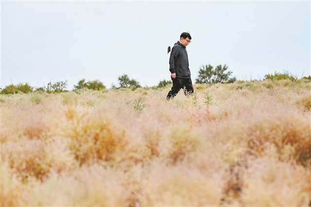 9月16日,内蒙古乌兰布和沙漠,易志坚教授在荒漠生态恢复区查看植物长势。 |