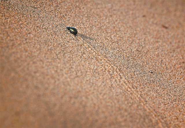 9月18日,内蒙古乌兰布和沙漠,重庆交大沙漠土壤化试验示范基地荒漠生态恢复区边缘,昆虫在爬行。 |