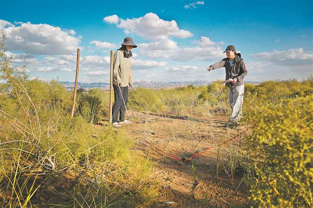 9月17日,内蒙古乌兰布和沙漠,重庆交大沙漠土壤化试验示范基地荒漠生态恢复区,团队科研人员在对植物进行测量。 |