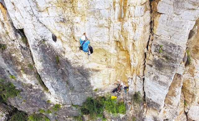 “第一次绳降是2017年7月在黄岩窝危岩,当时江风很大,人吊在空中晃得厉害,心里非常害怕。”王恒回忆,在距离江面100多米时,绳包不慎掉落,瞬间就被江水吞没,他顿时惊出一身冷汗。
