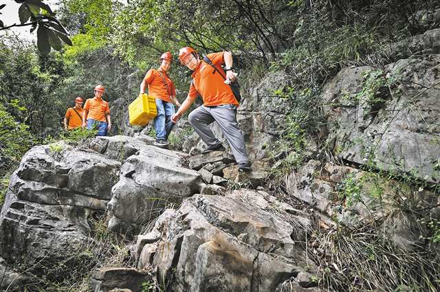 9月22日,几位驻守地质工程师行走在陡斜又打滑的岩石上。记者 张锦辉 摄/视觉重庆 |