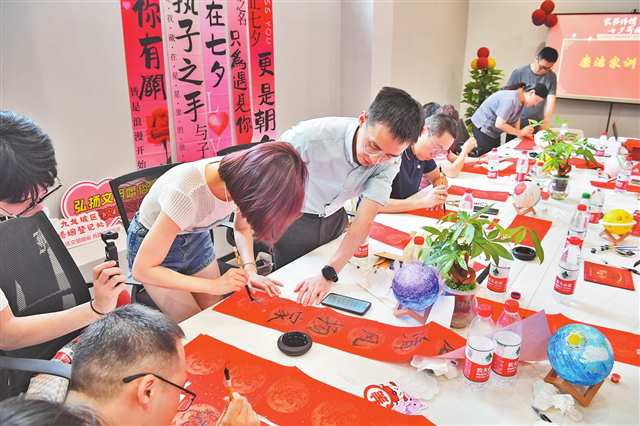 九龙坡区“家庭廉课堂”活动现场,新组成家庭的党员干部及家属现场书写廉洁家训。 |