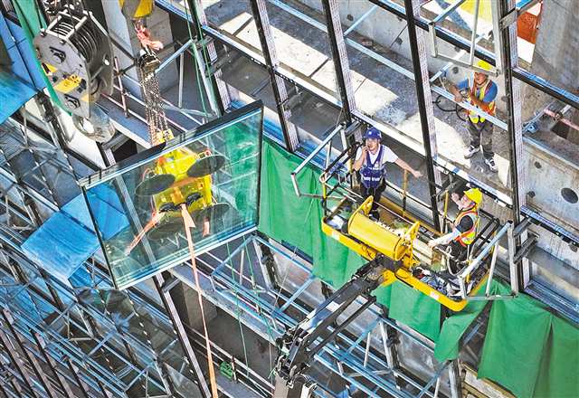10月9日,两江新区市民中心项目建设现场,工人正在进行外立面幕墙施工。该项目是市级重点民生工程,目前,整体建设进度已达61%。