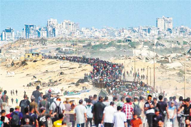 10月10日,在加沙地带中部,流离失所的巴勒斯坦人行进在返回加沙城的路上。新华社/法新 |