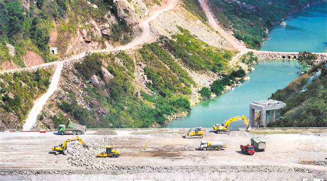 10月11日,綦江区赶水镇,国家重大水利工程重庆市藻渡水库大坝建设现场,车辆在大坝上穿梭不息,与挖掘机、推土机、洒水车协同作业,确保大坝填筑工程按计划加速推进(无人机照片)。