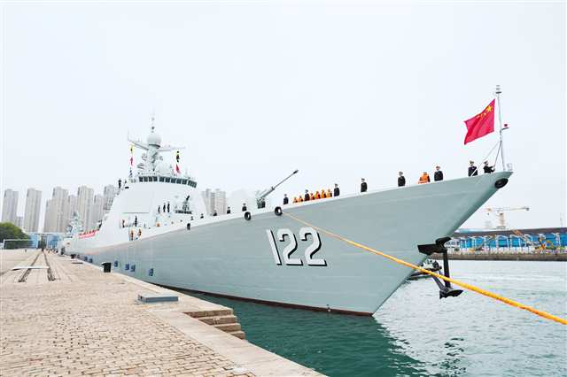 10月11日,中国海军第48批护航编队从山东青岛某军港解缆起航,赴亚丁湾、索马里海域接替第47批护航编队执行护航任务。这是编队中的导弹驱逐舰唐山舰驶离码头。