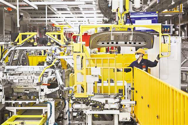 10月13日,位于巴南区大江科创城的智能网联新能源汽车智慧工厂,工人操作机器运输引擎盖。