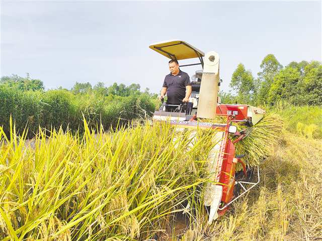 李刚驾驶联合收获机抢收水稻。(受访者供图) |