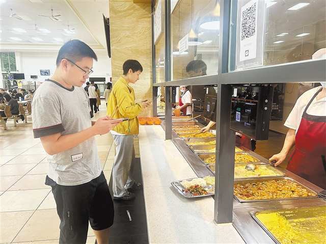 9月14日上午11点过,西南大学北碚校区楠园学生二食堂,学生们拿着餐盘,井然有序地在窗口前打饭。