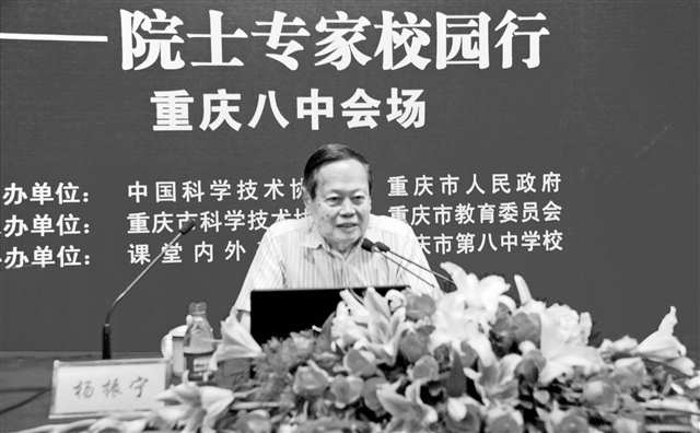 9月7日上午,在重庆八中逸夫楼,千余名中学生聚集一堂,杨振宁健步走入会场,出席“院士专家校园行”活动,他以《我的求学和人生经历》为题,像朋友一样跟学生们侃人生经历、聊学习方法、谈科学理想。
