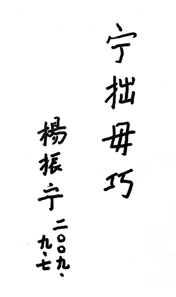 2009年9月,87岁高龄的诺贝尔物理学奖获得者杨振宁携夫人翁帆抵达山城重庆,出席中国科协第11届年会期间的多项活动。他走进重庆校园,分享自己的人生经历与科学感悟,并提笔写下“宁拙毋巧”四字,勉励学生:“学会诚实,投机取巧是没有前途的,做学问必须诚实,脚踏实地,才会成功。”