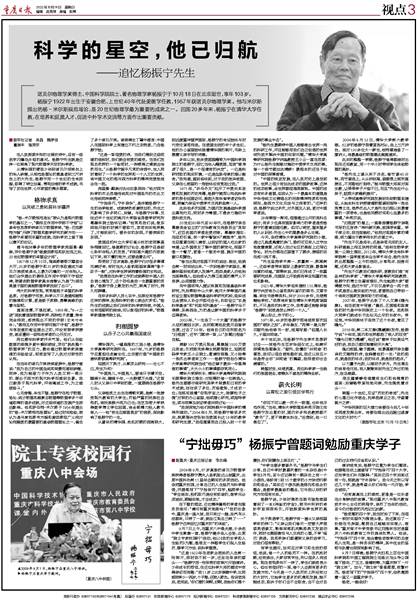 在下榻的酒店,这位精神矍铄的学者向服务员询问:“请问有重庆地图吗?”“我的印象中,重庆是一座火城,我只来过一趟,坐汽车从成都来,只待了一夜,就坐江轮去三峡了……”杨振宁这样回忆对重庆的“初体验”。