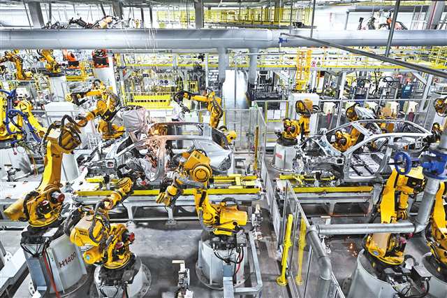 十月十三日,位于巴南区大江科创城的智能网联新能源汽车智慧工厂,机械臂正在焊接车身。记者 谢智强 摄\视觉重庆 |