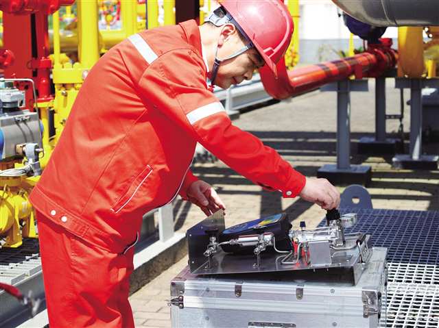 刘辉在永川作业区黄202脱水站检测天然气水露点 |