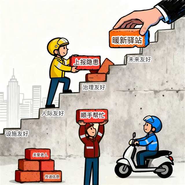 城市治理的台阶,不是单向铺就的。在重庆,城市自上而下递出“暖新驿站”等关怀,骑手自下而上担起“上报隐患”“顺手帮忙”的责任,共同搭建起“场景友好、人际友好、治理友好、未来友好”的向上阶梯。