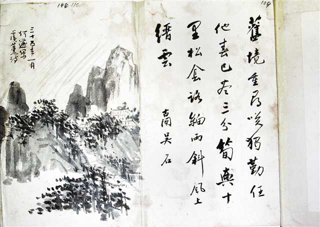 在这幅诗画作品中,左边是一幅重庆缙云山的水墨风景,右边则是署名“吴石”的一首诗作。