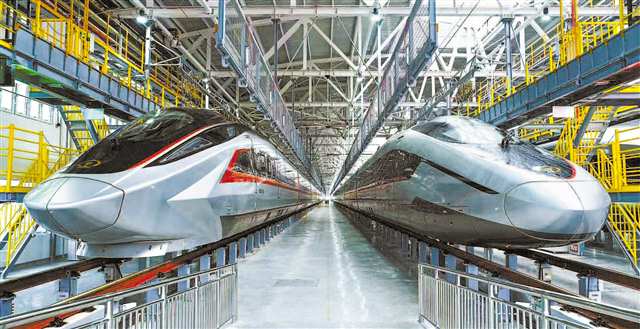 图为两列CR450动车组样车停靠在湖北宜昌动车所。唐莹 摄(人民视觉) |