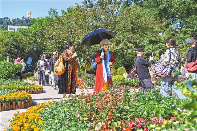 10月23日,重庆南山植物园,游客在菊花展上拍照留影。当天,重庆市第二十七届菊花艺术展在这里举办,菊展将持续至11月30日。