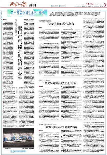 第十四届中国艺术节正在川渝两地举行,多部精品佳作轮番上演,收获广大观众和业界专家的高度关注和热烈反响。本期《两江潮》,我们特别推出一组评论文章,与读者共赏舞台精品,感受巴蜀大地与中国文艺碰撞出的璀璨火花。