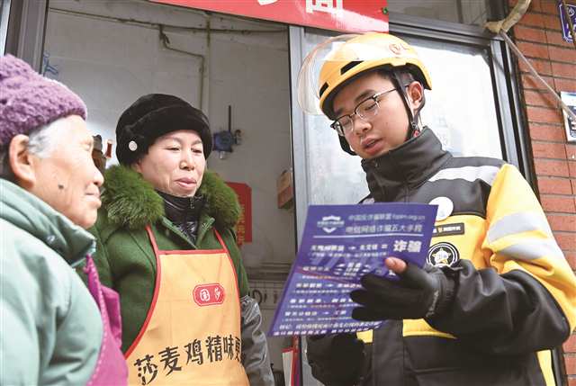 |   渝碚路街道汉渝路社区,“红岩骑手”喻文博在向老人们发放防电诈宣传单 |