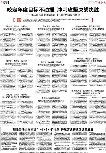 一、紧扣战略导向,聚力招大引强,提升发展“硬核实力”。突出“四企联动”,向上争取中国长安汽车集团落户,签约中国华电、中国能建、中国国新等区域中心和重庆总部;着眼渝港合作新地标、新场景、新范本,促成世奥桥项目(WOB)落户;引进低空经济龙头万丰奥特,促成京业汇西部总部投资打造航材智造等“两大基地”。