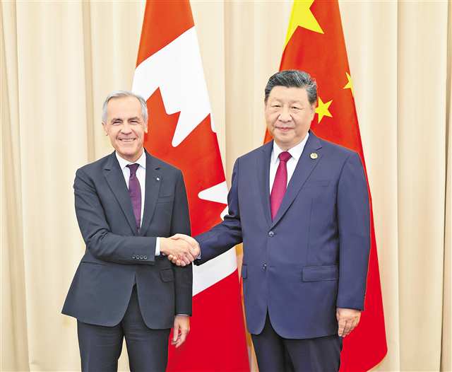 当地时间10月31日下午,国家主席习近平在韩国庆州出席亚太经合组织第三十二次领导人非正式会议期间会见加拿大总理卡尼。 新华社记者 姚大伟 摄