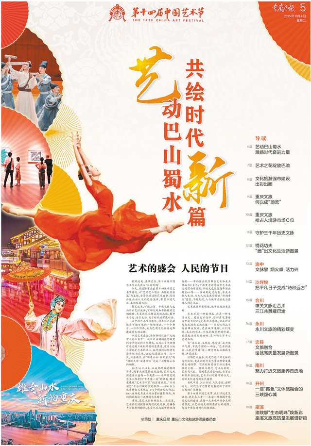 本报今日推出第十四届中国艺术节特刊,以“艺动巴山蜀水 共绘时代新篇”为主题,全景记录这场艺术盛事,深情讲述山水人文的巴渝篇章,彰显中国气派、展现巴蜀风情。