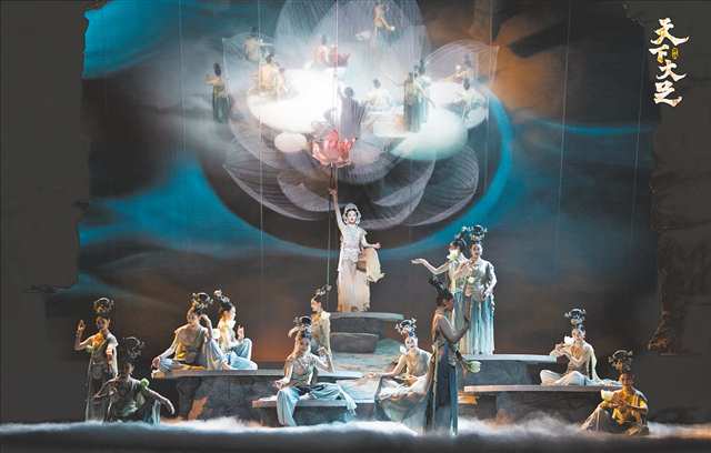 舞剧《天下大足》,取材于大足石刻群丰富的经典造像作品,将其化作展现大足百姓向往“人间小满”美好生活的意象。其舞台设计不仅还原了大足石刻的经典造像,还将其与生活场景相结合,展现了充满生活气息的南宋川渝图景。