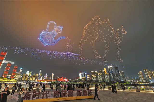 11月5日晚,“你好重庆”中阿合作主题无人机灯光秀开演。5000架无人机为中阿媒体记者带来一场以科技为墨,以光影为笔,融合了丝路回响与现代视听创造相互交织共鸣的跨越山海的文明对话。