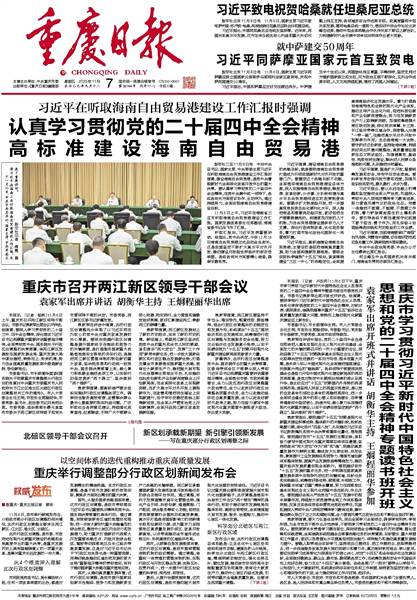 习近平致电祝贺哈桑就任坦桑尼亚总统习近平同萨摩亚国家元首互致贺电认真学习贯彻党的二十届四中全会精神 高标准建设海南自由贸易港重庆市召开两江新区领导干部会议重庆市学习贯彻习近平新时代中国特色社会主义思想和党的二十届四中全会精神专题读书班开班重庆举行调整部分行政区划新闻发布会