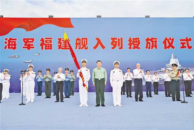 新华社三亚11月7日电 (记者 梅常伟)我国第一艘电磁弹射型航空母舰福建舰入列授旗仪式5日在海南三亚某军港举行。中共中央总书记、国家主席、中央军委主席习近平出席入列授旗仪式并登舰视察。
